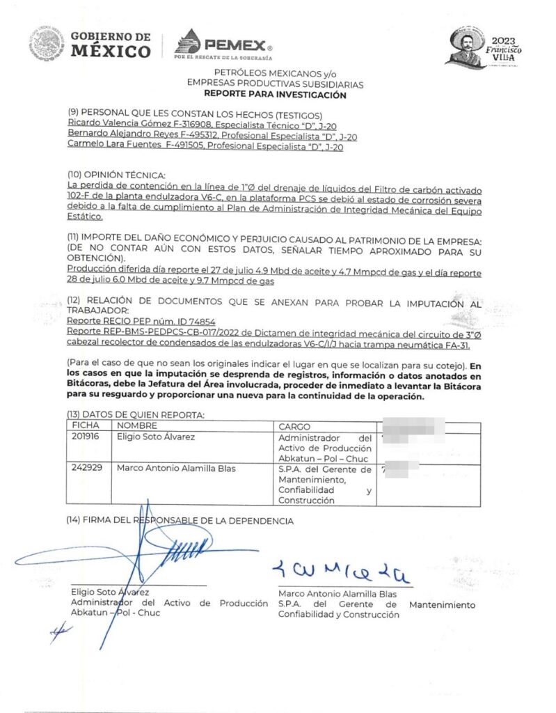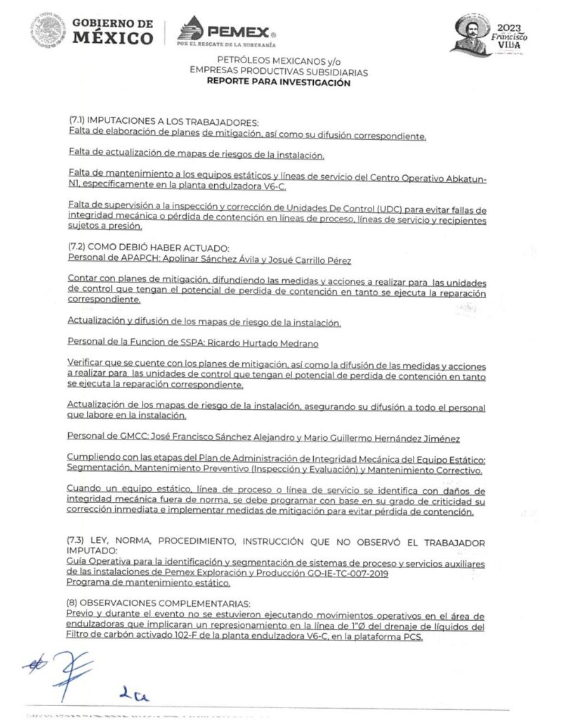 De acuerdo con el informe firmada por Eligio Soto Álvarez, administrador del Activo de Producción Abkatún-Pool-Chuc, y Marco Antonio Alamilla Blas S.P.A. Gerente de Mantenimiento Contabilidad y Construcción; señalan a cinco trabajadores como presuntos responsables de la causa del siniestro en el área de plantas endulzadoras son de la Plataforma de Control y Servicios del Centro de Proceso Abkatun-N1.
