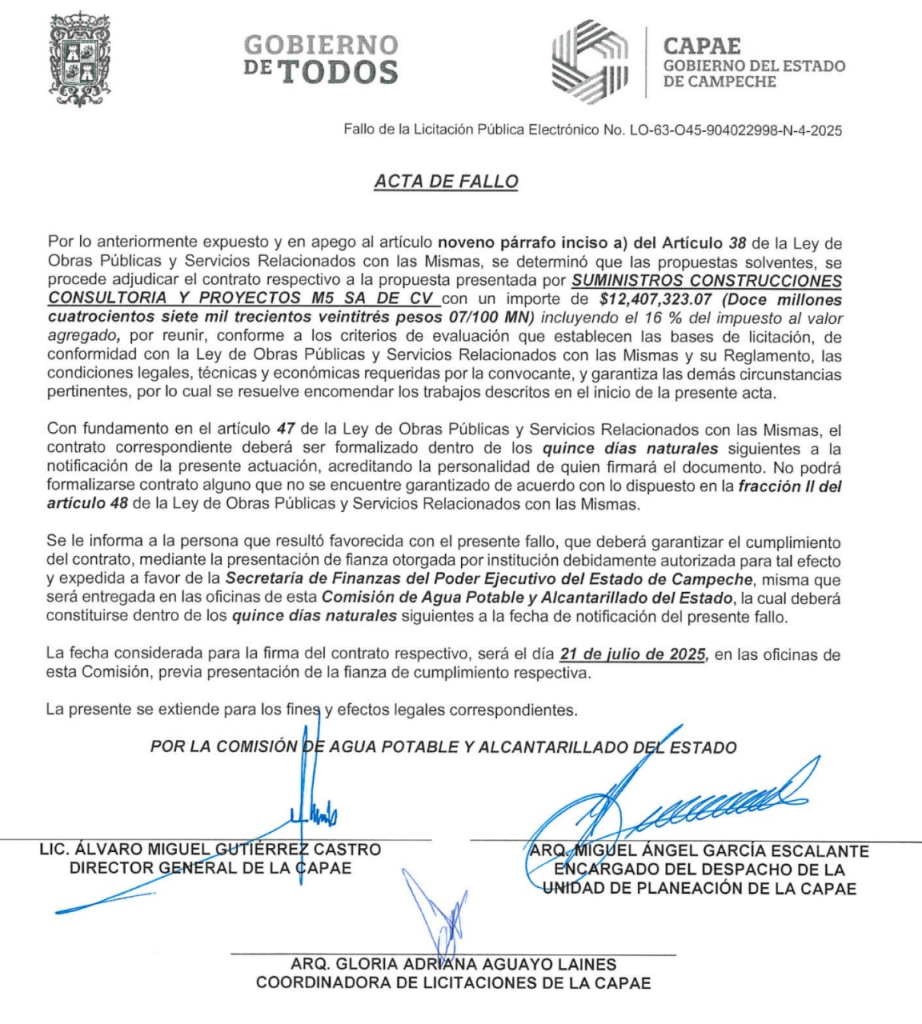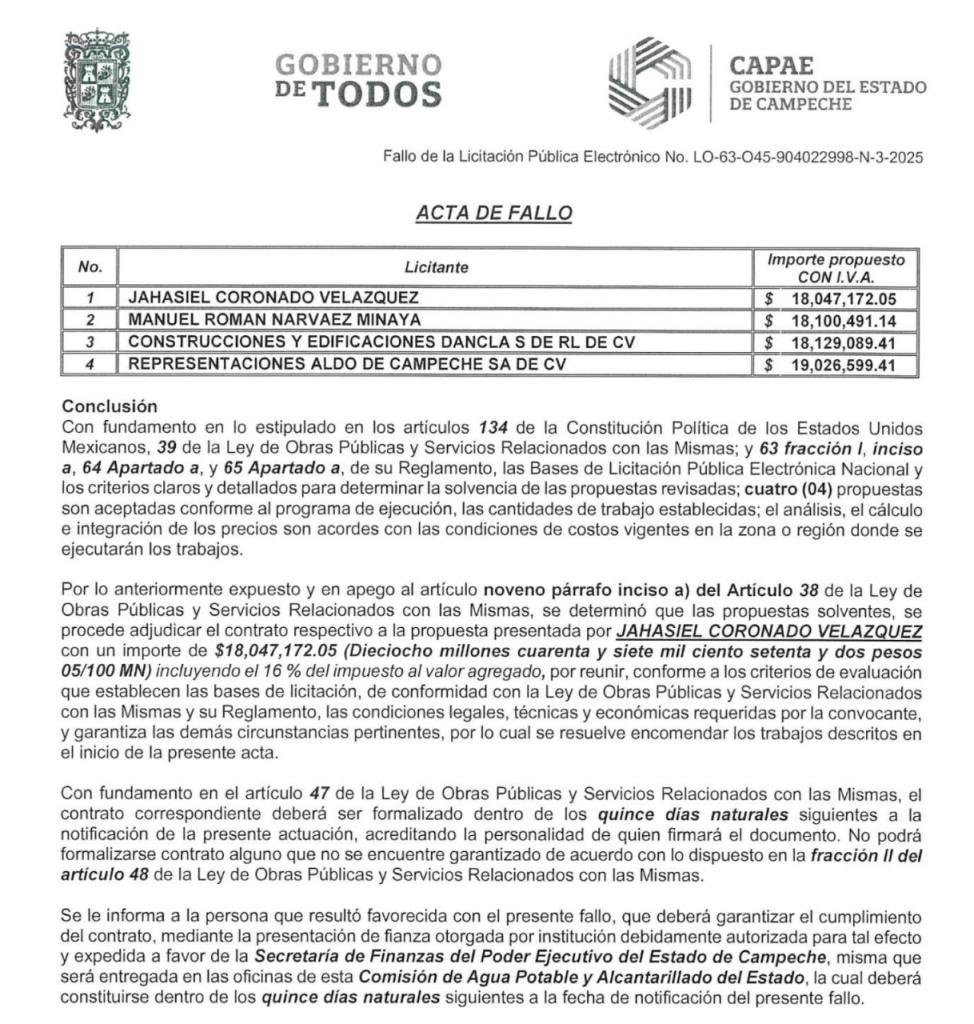 Lo más extraño, es que uno de los socios de la empresa, Marco Magdiel Hernández Cruz, como persona física, también obtuvo la obra de rehabilitación y ampliación del sistema de distribución y almacenamiento de agua potable en la localidad de Pedro Baranda, en Candelaria, por un monto de $9,600,454.61 pesos. Por los cuatro contratos, el grupo facturó a CAPAE la suma de 42 millones 223 mil 645.95 pesos.