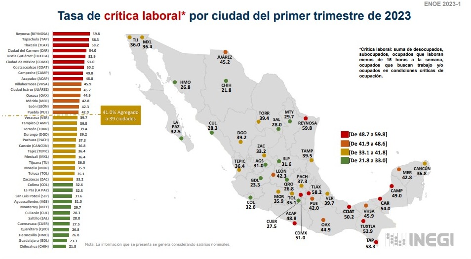 Ciudad del Carmen ocupa el 12º lugar nacional con una informalidad laboral de 48.6% con una tasa de ocupación del 28.7% en el sector informal, mientras que el 54% de la población económicamente activa empleada en un comercio o compañía se encuentra en una situación crítica así lo indica la Encuesta Nacional de Ocupación y Empleo (ENOE) del Instituto Nacional de Estadística y Geografía (INEGI) publicado a mediados del mes de mayo.