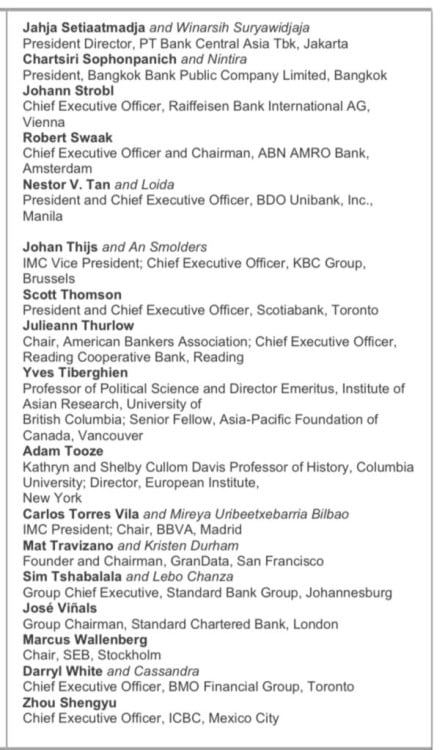 Fundada en 1954, la IMC representa a 30 países y sirve como un foro para discutir asuntos financieros globales, estableciendo relaciones entre líderes bancarios, miembros del gobierno y asociaciones invitadas. Este prestigioso evento ha tenido lugar en ciudades como Dubái, Múnich, París, Washington D.C., Londres y Singapur.
